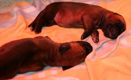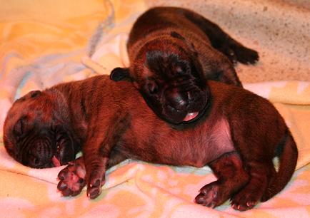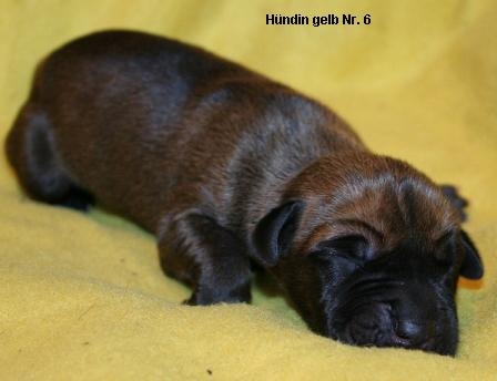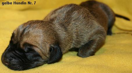 | Krümel Rüde gestromt Nr. 5 | Kendra Hündin gelb Nr. 7 |