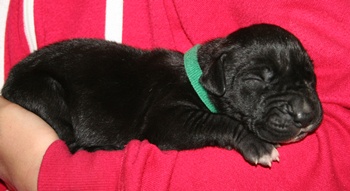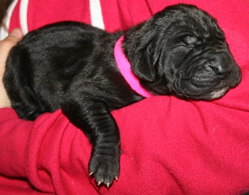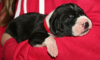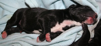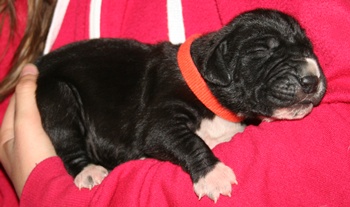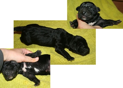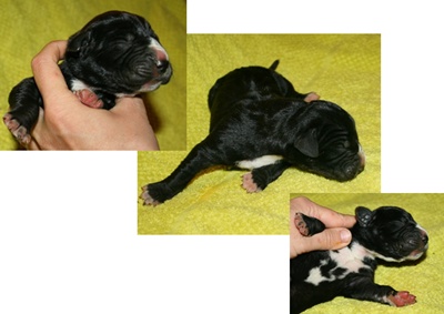 Hündin schwarz Nr. 7 Abzeichen: Riesen großer weißer Brustfleck bis unter dem Hals, kleiner weißer Nasenrücken, weißer (T-) Strich im Nacken, alle 4 Pfoten weiße Abzeichen