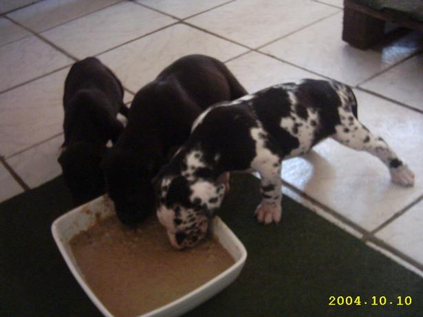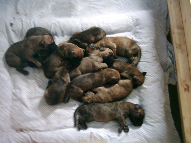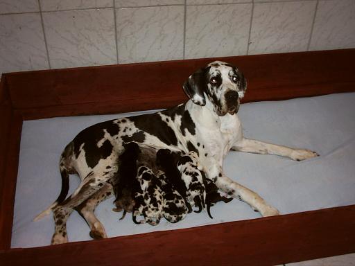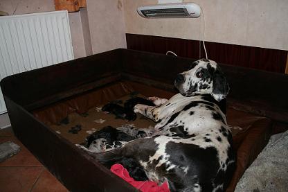 großen Würfen Unmengen an Milch produzieren. Damit ihre Kondition nicht unnötig unter den Kindern leidet, achten wir darauf sie nun besonders hochwertig und sorgfältig zu ernähren. Welpenmilch, sowie Calciumpräparate, Aufbaukonzentrate aus der Apotheke und hochwertiges Fleisch als Zusatz zum Leistungsfutter sind für uns hier eine Kombination, mit der wir immer gut gefahren sind. |
